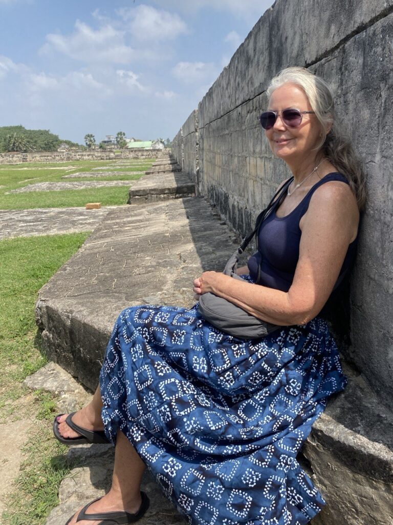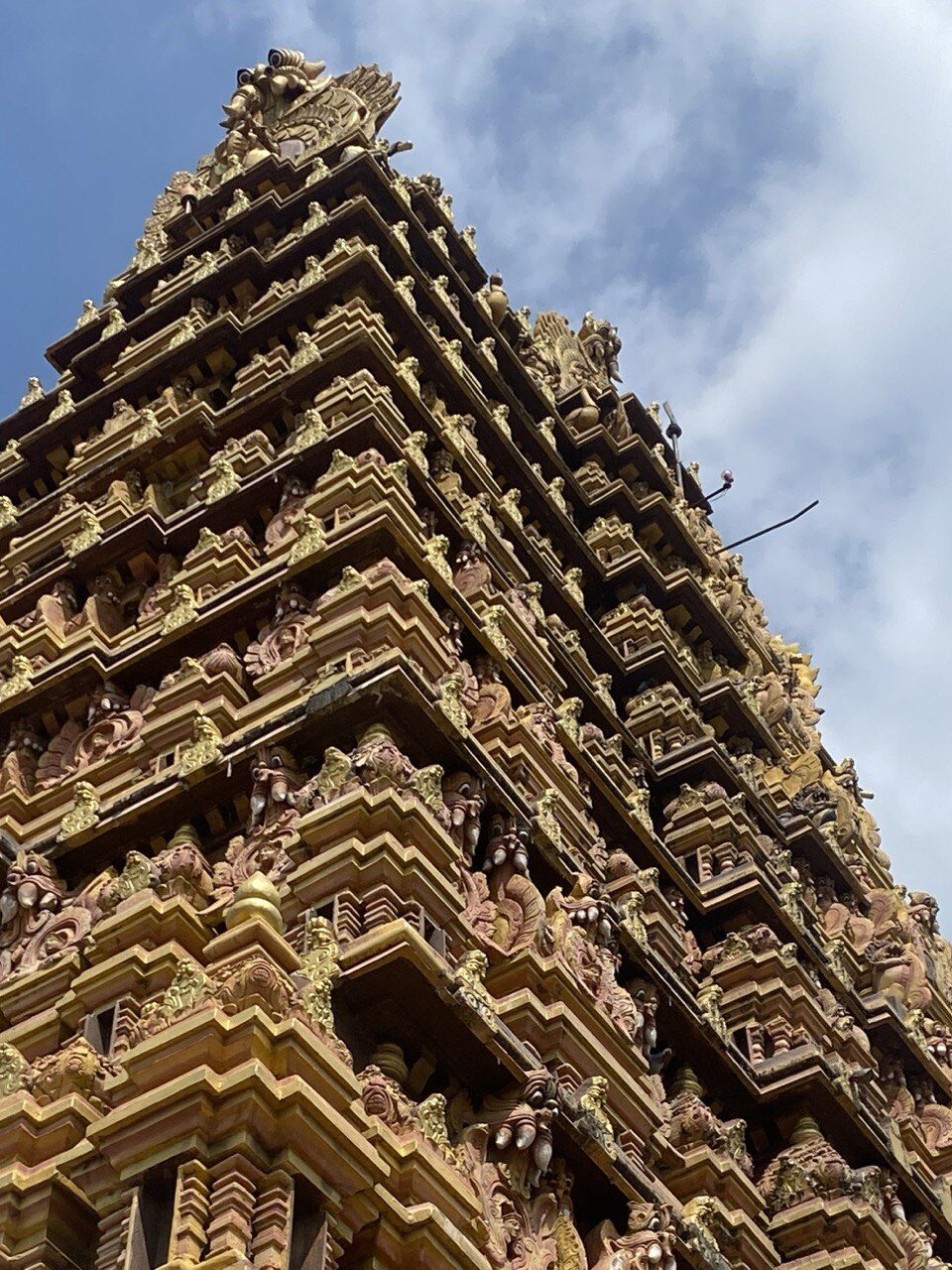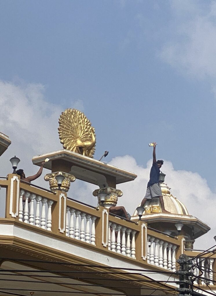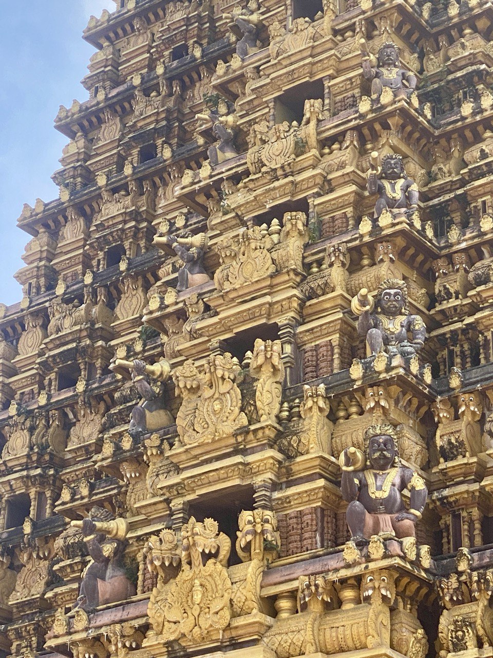 After a junk lunch in a shopping centre (the place had good reviews, and we just fancied a burger with chips – very good it was too) we got a tuk tuk to the temple, which was impressive, but closed. Google said it opened again at three, so we killed half an hour over mango nectar at a local caff. This time I had not only to shed hat and flip-flops and don a sarong, but lose the t-shirt too. Sheer magnificence. Sadly, photography was strictly prohibited; sadly because the place was wonderful, and rich with photo opportunities – all ornate columns supporting filigree-edged arches receding into the shadows, priests superbly silhouetted against the gold, shimmering in the blazing sunlight. But we much relished it even if I couldn’t record it, enjoying the peace and the gorgeous, brightly-coloured artwork.