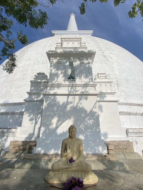 Flushed with success, we headed off in search of sights and after only a few minutes pretty much stumbled across what I’ve now discovered to be Sada Hiru Seya: a truly vast hemispherical stupa, (second largest in the country apparently), which, it turns out, was built this century, in remembrance of members of Sri Lanka’s armed forces who died in the country’s civil war. A man selling flowers to lay before the Buddhas insisted on 200 for parking, on what authority I have no idea, but he did look after V’s helmet, and also told us that we could go up the road over the road, which led to Jaya Sri Maha Bodhi, the sacred fig tree grown from the original Bodhi tree in Bodh Gaya, India, under which the Buddha attained enlightenment, which is widely held to be the world’s oldest human-planted tree with a known planting date – 288 BC.