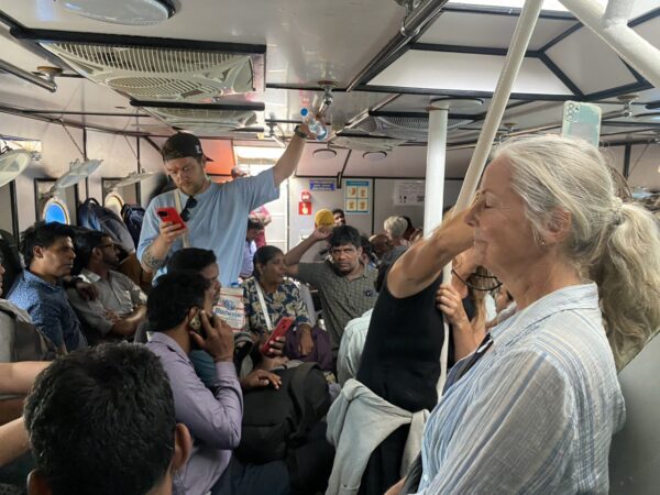 Ten minutes in, a couple of Sri Lankans headed up the steps. We made to follow, gagging for fresh air. But were stopped. V said she thought they’d been ok’d because the boy was sick. Ok. Then a Sri Lankan mother and daughter (I’m guessing) also climbed the stairs, though neither seemed at all out of sorts. Crew made it clear no-on was to follow. I proposed to V that we grab their seats; we could always relinquish them if they reappeared. But they never did, so we did at least have seats for the remainder of the crossing, which definitely counts as a highlight of the day.