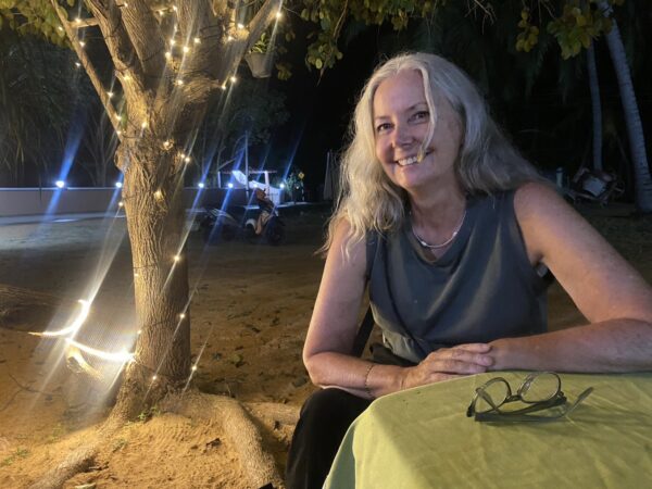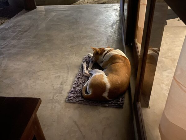 An hour or so later, and via a quick trip to the wine shop to get my fix, and a bakers, where we got some roasted bread (quite nice, but hard to see what the fuss was about, TBH), we got a tuk tuk ride to our hotel, which has turned out to be very nice – all low-slung huts with reed-topped roofs for the tropical feel, plus air conditioning. And friendly dogs, one of which seems to have adopted us, and parked himself on our mat.