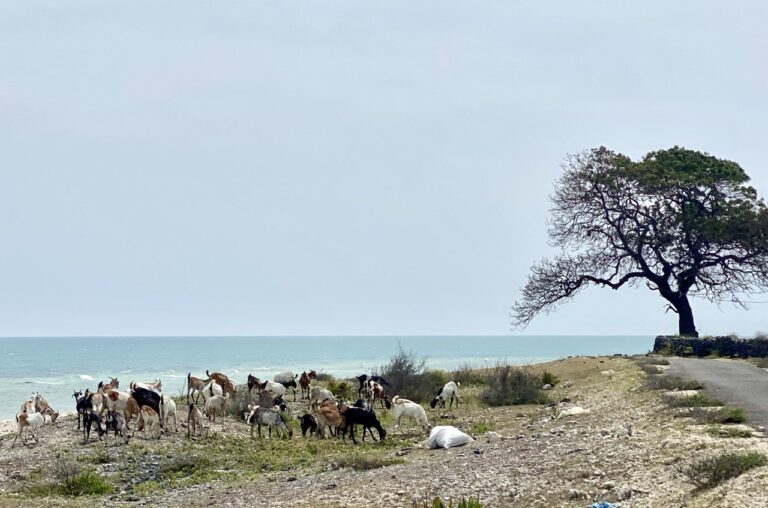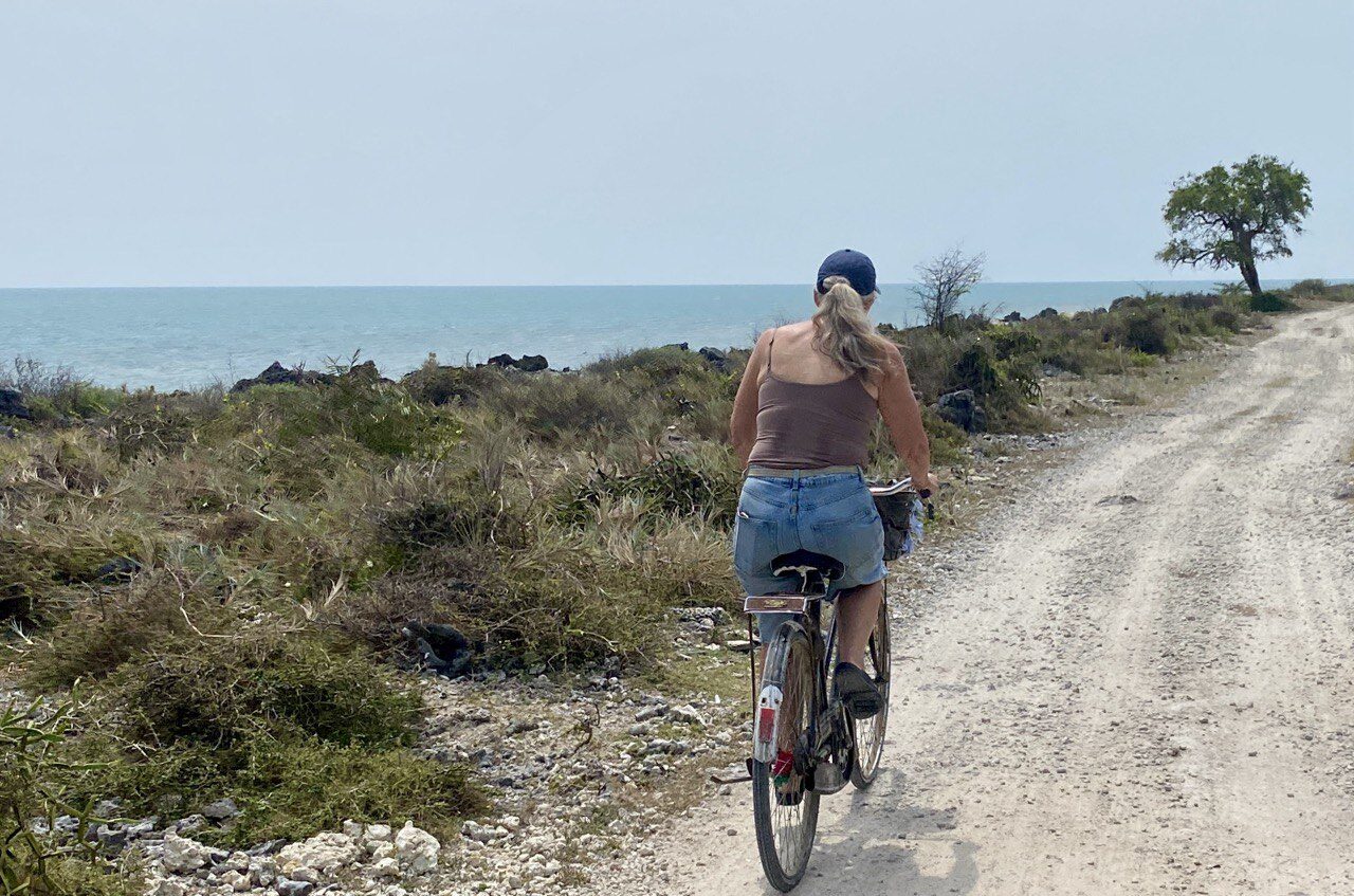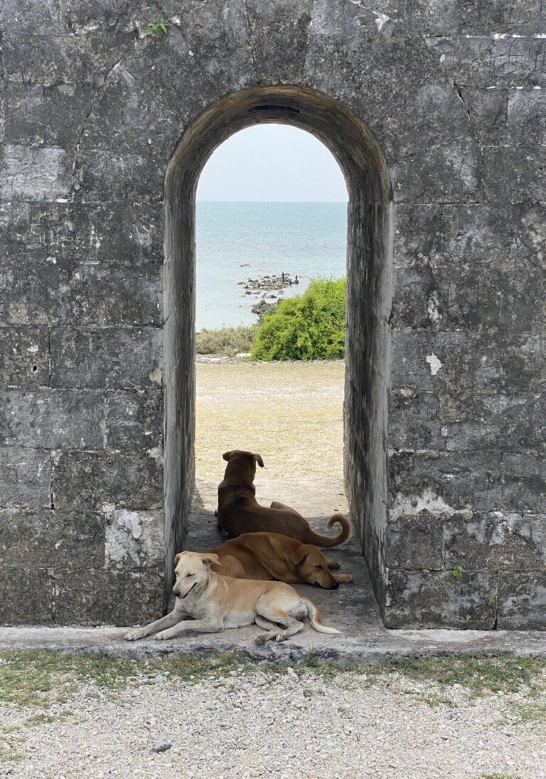 Then back on the bikes for another bruising, and lengthy, trek to item #2: Queens Tower. We had no great expectations, which proved to be just as well: though old, dating back to the Dutch occupation, it was a squat and unremarkable construction of coral and limestone – in very good nick, given its age, to be fair – whose most interesting feature was the doggies taking shelter from the sun. Happily, the juice bar we’d expected to find at the watchtower yesterday turned out actually to be here, and we were able to enjoy a ‘mixed fruit’ juice – a combination of aloe vera and cactus fruit, which is what makes it that ravishing pink.