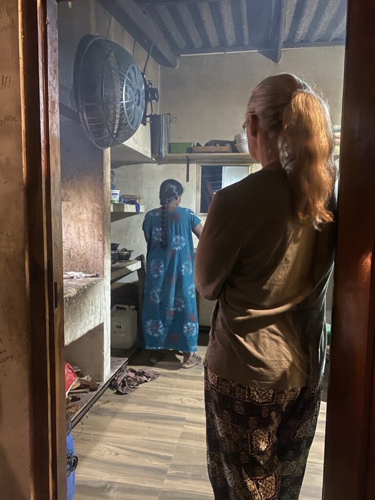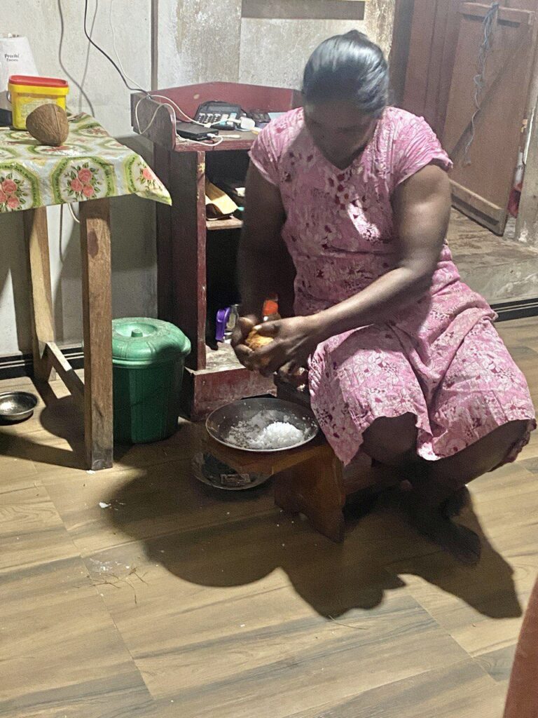 For a finale, Virle got to do something she’s been wanting to do since we got here: watch and help out with some cooking. Preparing tonight’s meal, with the women in the little kitchen here, she sliced aubergines, chopped onions, and watched as the women prepared a meal for ten on a couple of wood-fuelled burners. In truth she didn’t learn quite as much as she’d hoped – all spices were in unlabelled jars (many home made toboot), so though she could see how much they put in, she couldn’t actually see what was being put in. One thing she learned for sure: Sri Lankan cooking involves a lot of oil and loads of salt. As I said, ‘That’s what makes it taste so nice.’ Still, it was a great – and dare I say it, genuine – experience, of a kind you don’t get on most tourist maps.