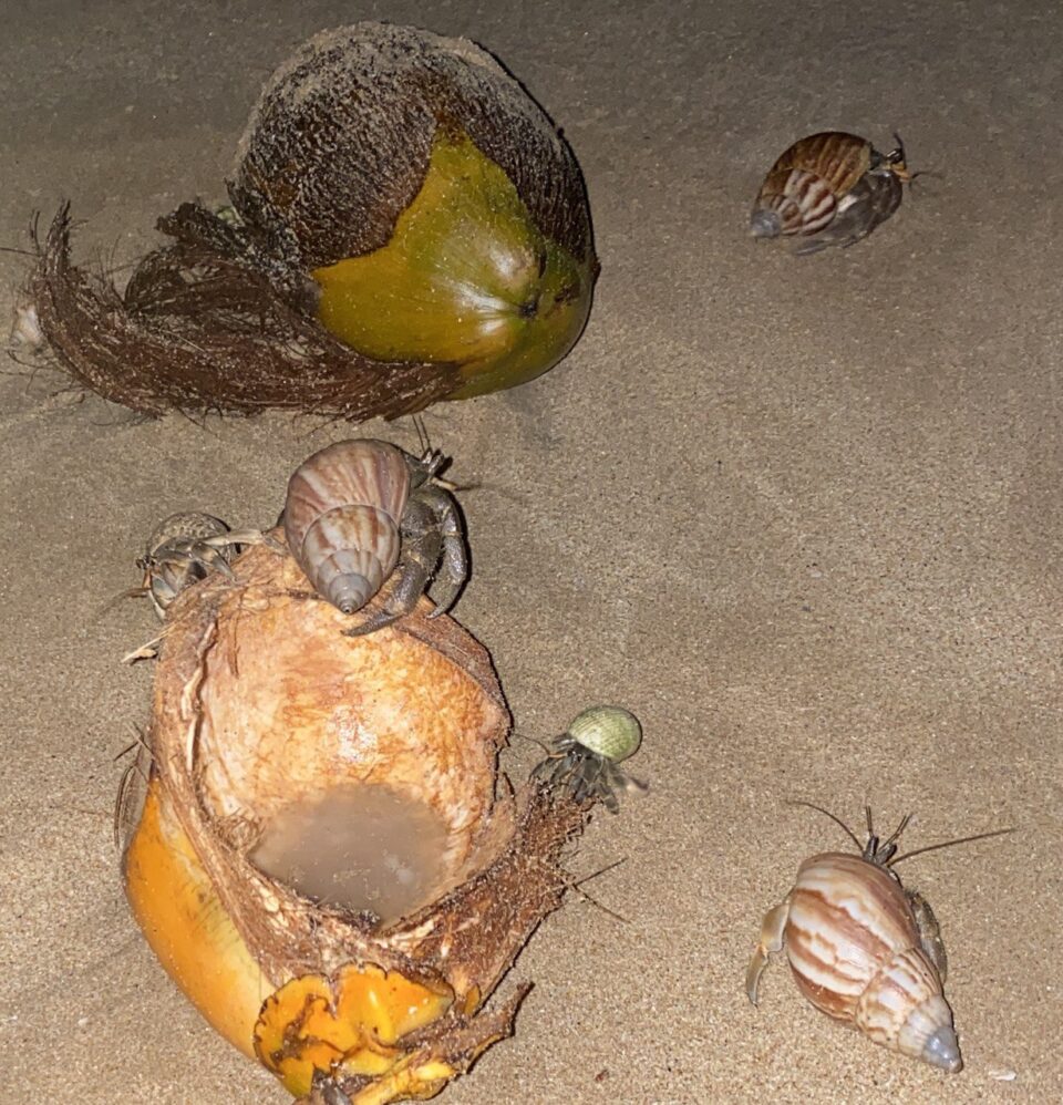 Went for a walk along the beach last night, having been told this is prime giant turtle time – three were spotted crawling up the beach a couple of days ago. No turtles, but we did get a bonus when Virle stopped to take a closer look at something on the beach that looked somehow a bit…odd. A phone torch revealed a broken coconut shell heaving with hermit crabs. They clearly didn’t appreciate the attention, and headed for the hills. By the time I’d managed to get my flash working they were nearly all gone. But it made a cheery end to the day.