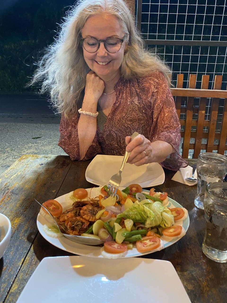 Same again please! But no. Curry and rice is lunchtime only. Sob. Ok, from the three item menu, we chose option one: grilled giant prawns and vegetables. A couple of minutes later the guy running the shack emerged from the kitchen to pop next door to a vege stall, returning with a bag of tomatoes, cucumbers and who knew what else. Then back into the kitchen for a good half hour’s crashing and bashing, till out came a large platter piled high with veges and a big pile of seriously big prawns: a dozen or so, each the size of your little finger. And absolutely delicious it was – the prawns tasty and firm-textured, the veges (fried and raw on the same plate) tasty and plentiful.