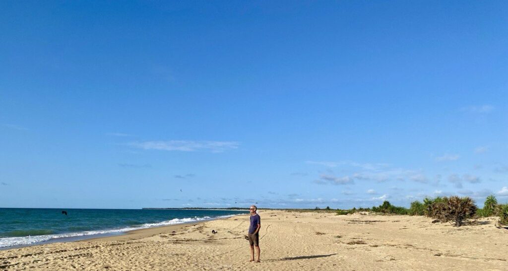 That looks like fun! Not for us though, just lazing around on this otherwise completely deserted beach. The wind has dropped in recent days, so the sea is clearer, and even less choppy, and with the gently-shelving sand, just lightly seasoned with coral fragments, it would be hard to imagine a nicer place to idle away an hour. No more, because despite our extensive base-layering, with sun this hot you still have to be very wary, lest you go full tomato.