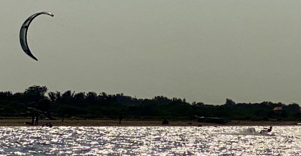 Took a little trip after our siesta to the local windsurfing/kitesurfing beach, where the young doods and doodesses were displaying their really very impressive skills, then to our favourite beach for a last afternoon swim. We ended up staying to watch the sunset, with a fair number of locals who – unlike mad dogs and Englishmen – have the good sense to stay off the beach till the sun has lost its ferocity. Then back for a delicious chicken curry dinner before heading back, still buzzing slightly from the heat – climatic and culinary.