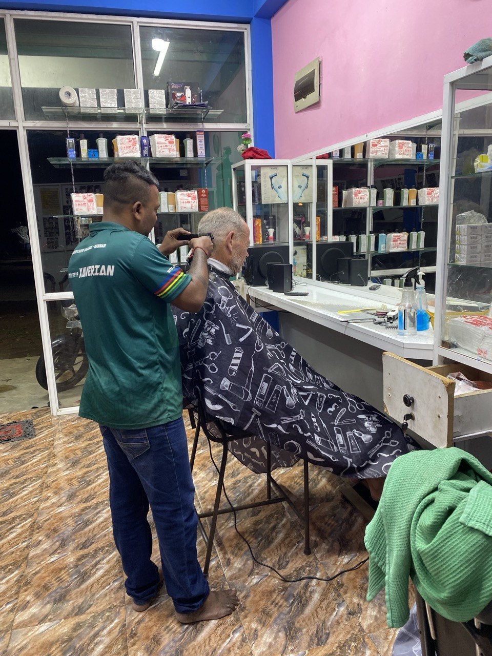 Anyway, they were supposed to pick the bike up at six, and we were there as per, but they didn’t appear. Six-thirty, we left to get my overdue haircut, leaving the hire fee with a guy at the hotel. When we returned, the bike was gone. The barber, meantime, had done a belter of a job. Took a good long while over it, getting the segue from short sides to longer top just perfect, with some very fancy scissor-work, as well as sorting out all the bits that grow where they didn’t oughta when you’re ancient. Honestly can’t remember ever looking so well groomed in my life.